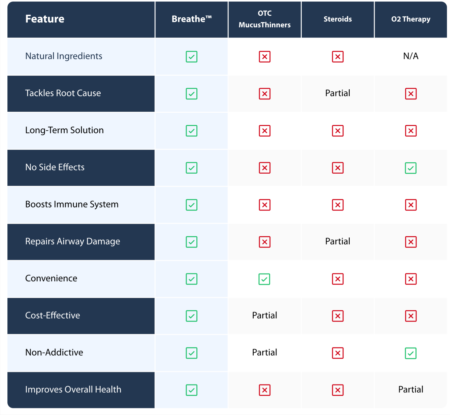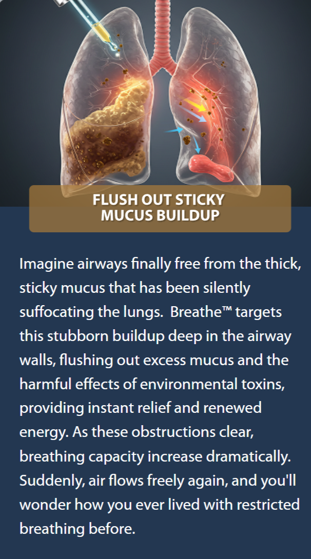 Breathe™ is a scientifically engineered lung-clearing formula, meticulously designed to melt the stubborn mucus that suffocates your airways.