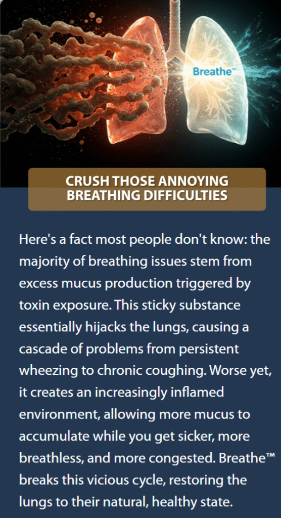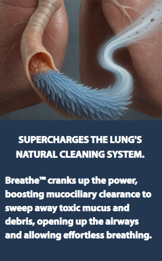 But now, modern science meets ancient healing in Breathe™ — the first lung-clearing formula designed to do more than just manage symptoms. It actively restores lung tissue, melts toxic mucus, and strengthens respiratory function at the cellular level.