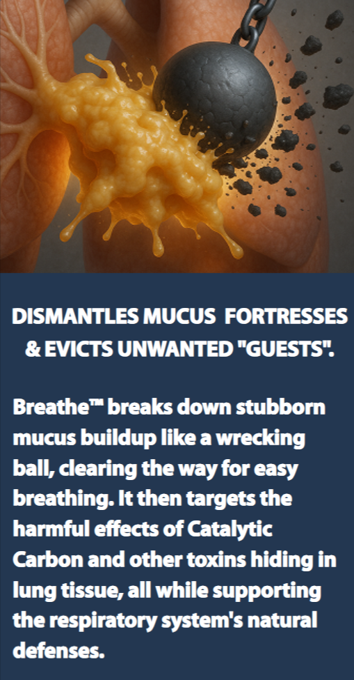 ✅ Breathe™ — the world’s first natural lung support formula designed to clear mucus nets caused by Catalytic Carbon and support true lung regeneration.