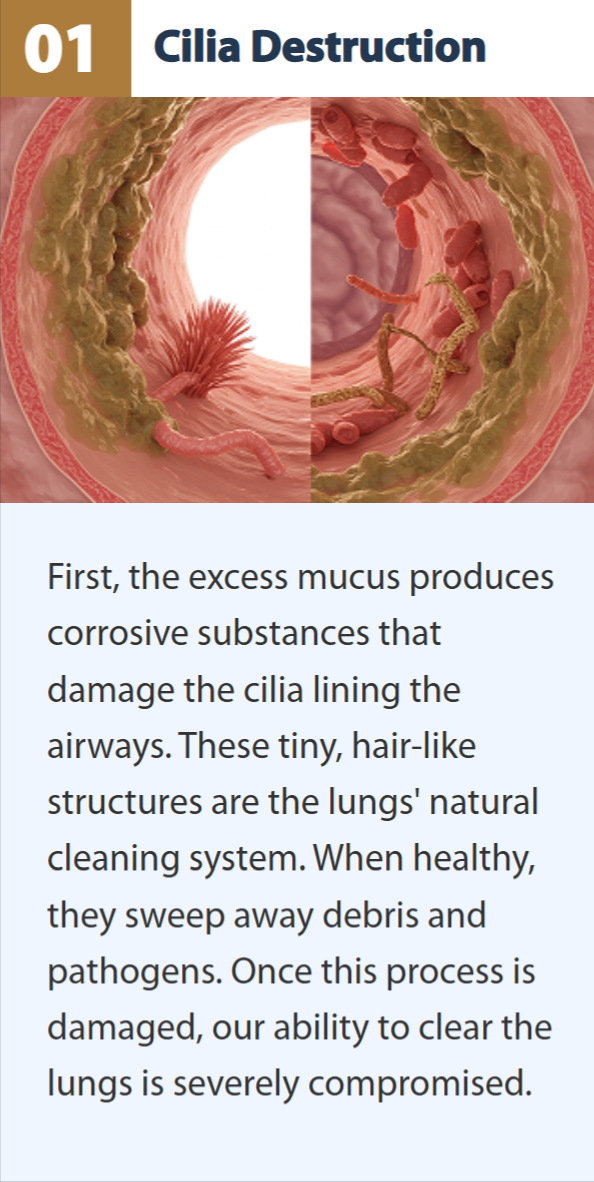 Trapped mucus becomes a breeding ground for infections — pneumonia, bronchitis, even lung collapse. Conventional meds can’t reach the root cause, and symptoms worsen.